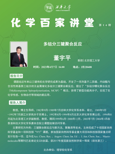 报告内容:课题组近年来以三键有机化学研究成果为基础,开发了一系列基于二异腈、内炔酯与含活性羰基第三组分的无金属催化多组分三键聚合新反应,提出了“多组分螺化聚合反应(Multicomponent Spiropolymerization, MCSP)”概念,获得了新型功能高分子,实现了在化学传感、生物诊疗等领域的新应用。