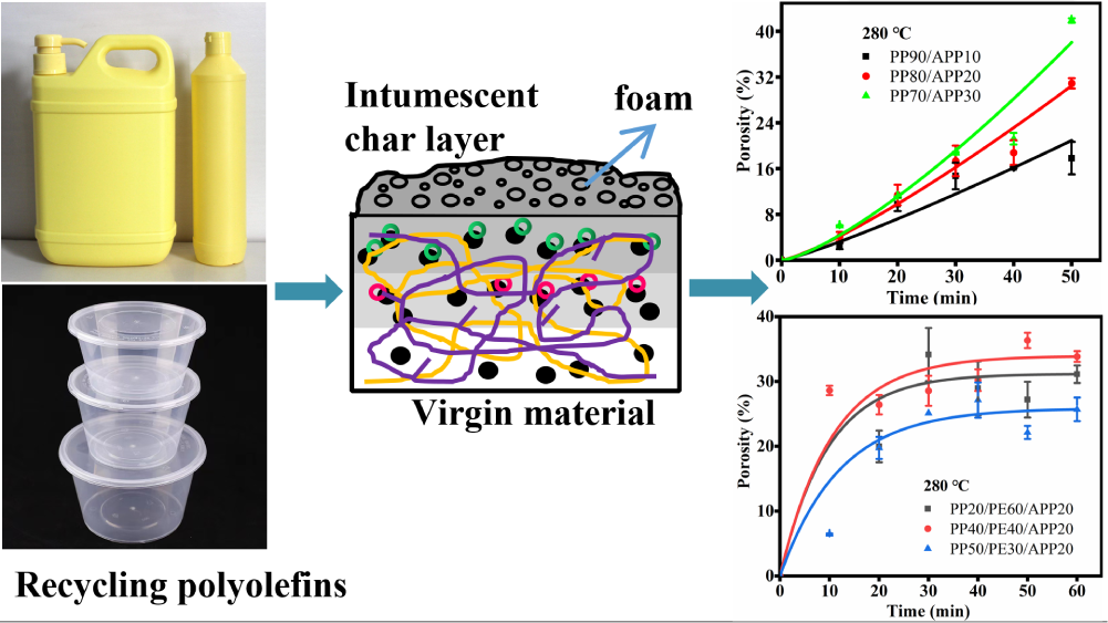 在所有塑料中,一次性塑料(SUP)的使用寿命最短,因此给环境带来了巨大的压力。聚丙烯(PP)和聚乙烯(PE)统称为聚烯烃(PO),占全球主要塑料产品的60%和包装垃圾的76%。聚磷酸铵(APP)是一种传统的膨胀型阻燃剂(IFR)的发泡剂,热分解时会产生大量的小分子气体。利用这一特点,本文研究混合的一次性塑料的热化学发泡行为,揭示了APP在PP和聚烯烃(PO)共混物中两种不同发泡规律和机理。最后,将消费后的塑料共混物的热化学发泡材料与聚苯乙烯泡沫进行了比较,表明本研究的热化学发泡材料具有作为建筑保温隔热材料的潜力。基于这些结果,我们相信这项研究不仅使人们更好地了解典型IFR的热分解行为和PO及其共混物中膨胀泡孔的生长行为,而且将促进消费后的塑料,特别是混合的消费后的塑料直接转化为潜在的阻燃泡沫塑料。