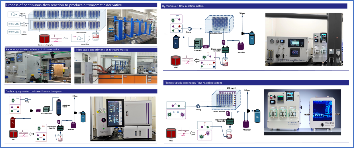 开发了多种安全、高效的连续硝化、连续催化氢化、连续光催化、连续臭氧化等新方法或新工艺。反应时间仅几秒至几十秒,最高产品通量达80吨/年,工艺可无缝放大,极具工业化应用前景。