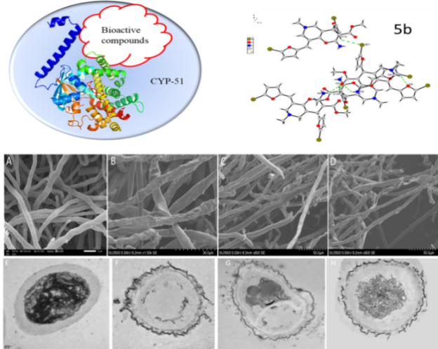 为了发现结构新颖、药效高、作用机制独特的新型CYP51抑制剂,利用计算机辅助药物设计方法理论设计并合成了34个结构新颖的4H-吡喃[3,2-c]吡啶衍生物,所有目标化合物通过1H NMR,13C NMR,HR-MS,IR进行结构表征,并对化合物5b进行了单晶培养,通过X-ray对化合物5b结构进行了鉴定。随后34种目标化合物对5种植物病原真菌进行活性测试,结果表明大多数化合物在16 g/mL的浓度下对五种真菌具有显著的杀菌活性,其中化合物7a、7b和7f表现出优异的抑菌活性。进一步活性测试研究发现,化合物7a、7b和7f对番茄灰霉病菌的EC50值分别为0.326 g/mL、0.530 g/mL和0.610 g/mL,抗菌活性优于氟环唑(EC50 = 0.670 g/mL)。使用SEM和TEM对菌丝与细胞进行了观察,结果发现化合物7a和7b具有比阳性对照更好的作用效果,如图1所示。