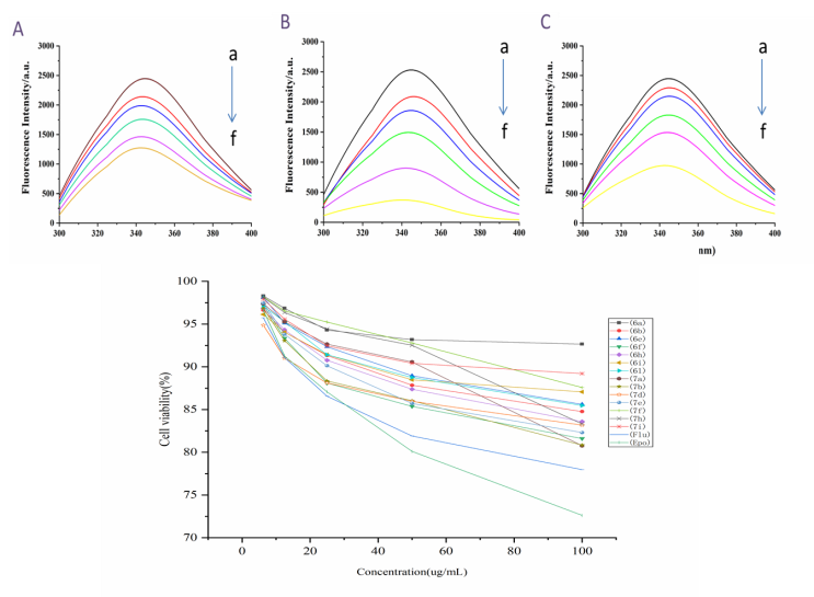 为了发现植物病原真菌中潜在的甾醇14α-去甲基化酶(CYP51),课题组首次对植物病原真菌进行了酶的提取,随后进行酶活性测试,结果表明它们对CYP51的IC50值分别为0.377、0.611和0.748 g/mL,具有比氟环唑更好的抑制活性(IC50 = 0.802 g/mL)。此外,蛋白质荧光猝灭实验结果与上述实验结果一致。我们对部分目标化合物进行了细胞毒性测试,结果表明测试化合物均未表现出显著地毒性,如图2所示。