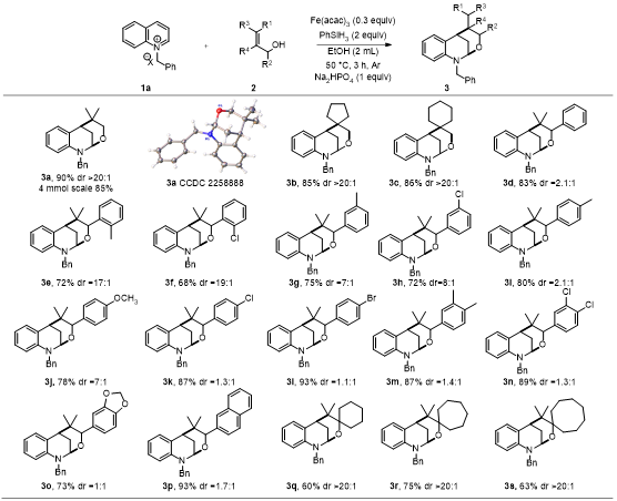 作者以N-苄基喹啉季铵盐1a和2-甲基烯丙醇2a作为模板底物,对催化剂、还原剂、溶剂、温度、时间和添加剂等进行筛选,得到最优条件:在氩气氛围下,以乙醇为溶剂,乙酰丙酮铁为催化剂,苯硅烷为还原剂,磷酸氢二钠为添加剂,50度油浴下反应3小时,最高91%的收率得到目标产物。作者通过1H NMR,13C NMR,HR-MS、XRD对化合物3a进行了结构鉴定。