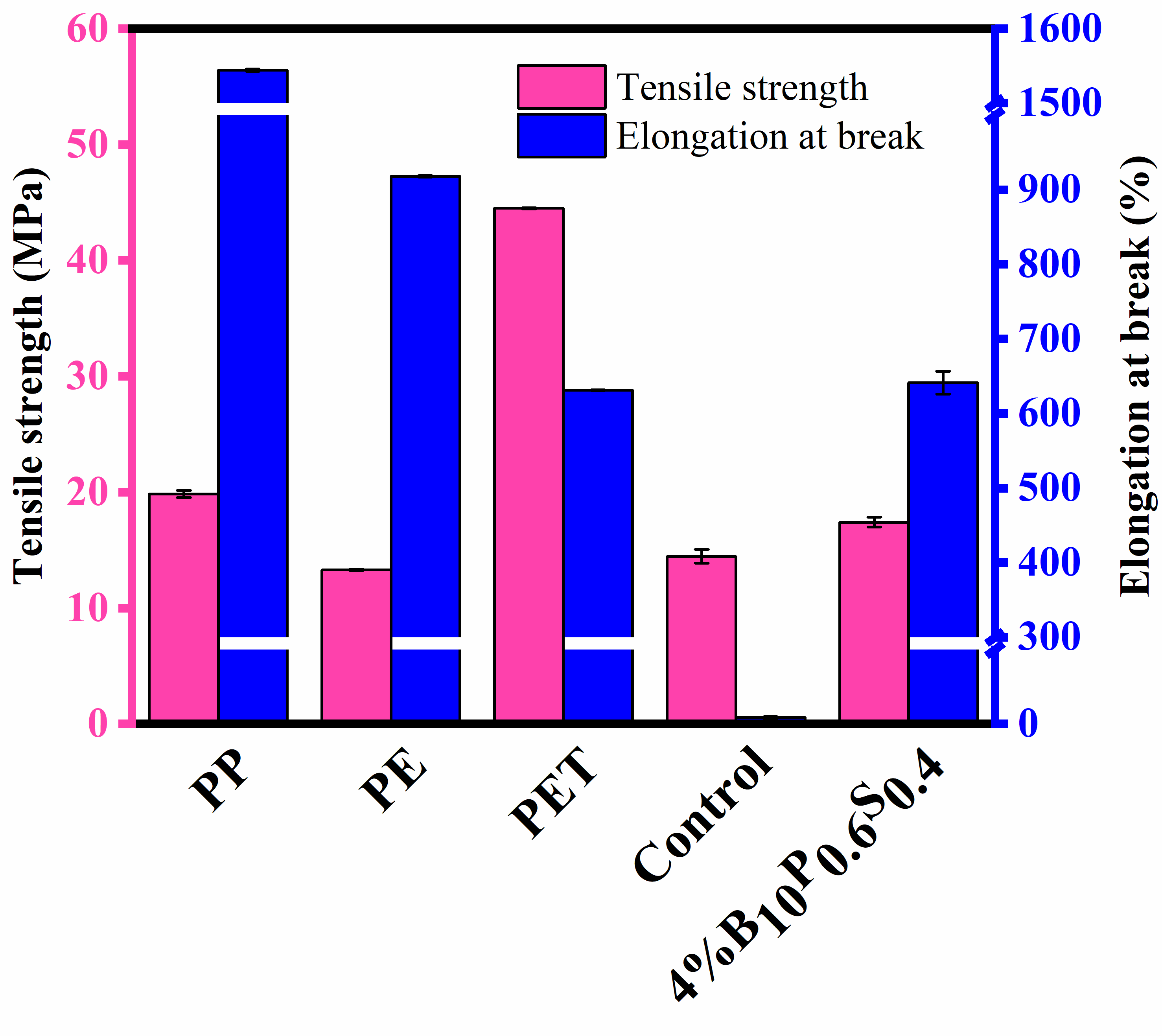 图2.三元一次性包装塑料合金的拉伸强度和断裂伸长率。