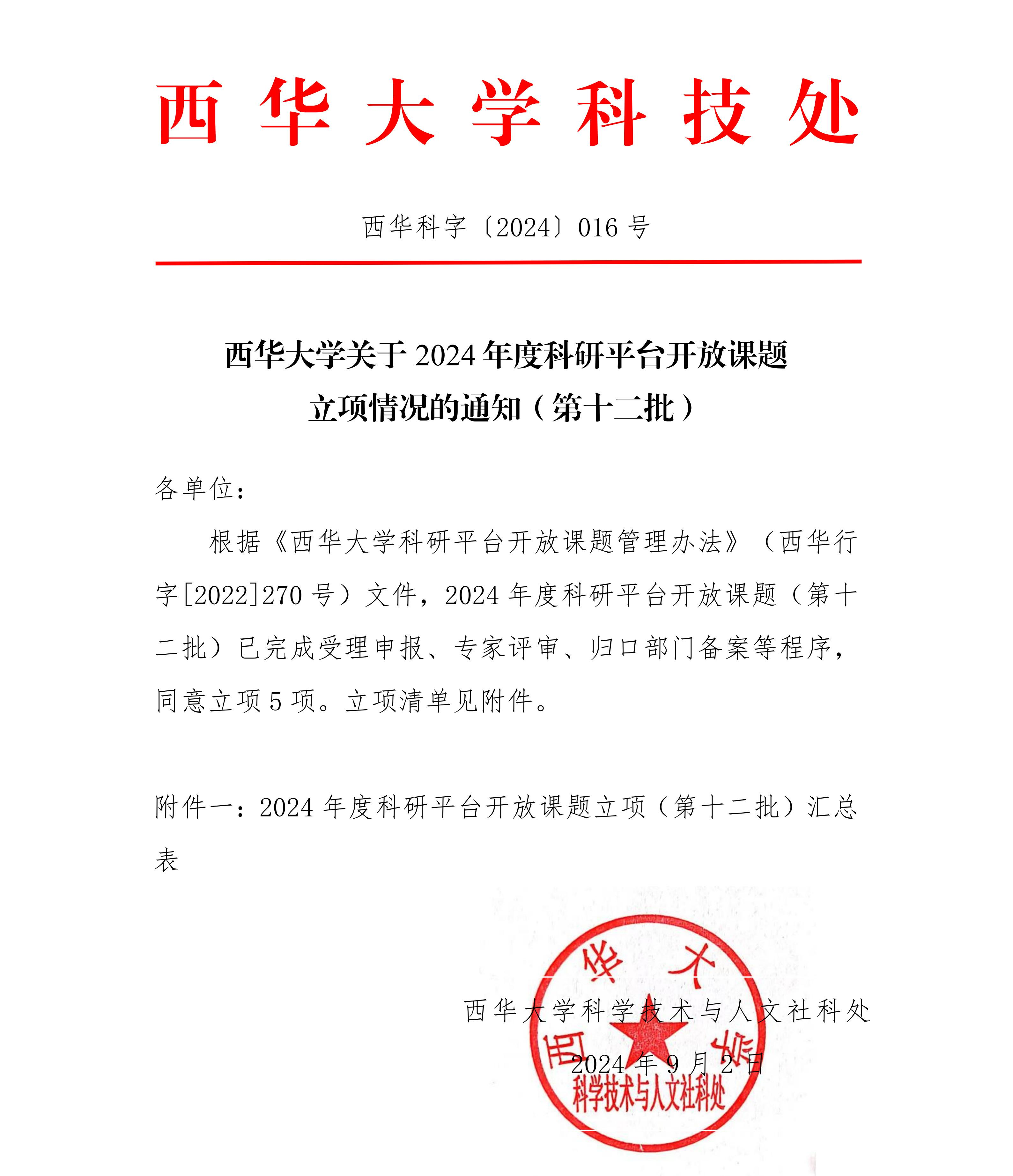 西华大学关于 2024 年度科研平台开放课题立项情况的通知(第十二批)