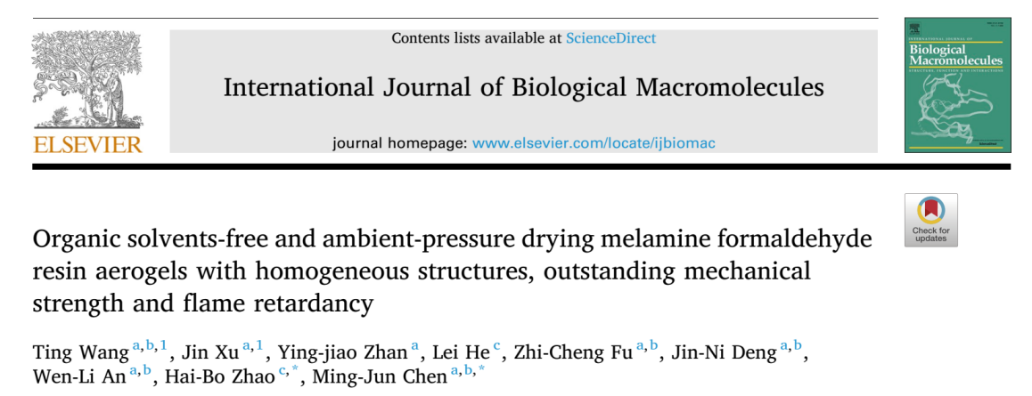 此外,创新地利用聚合物原位聚合三聚氰胺甲醛树脂的方法,成功实现兼具强度和韧性的三聚氰胺甲醛树脂的合成,实现无溶剂置换的常压干燥法制备高强度本征阻燃的三聚氰胺甲醛树脂气凝胶材料。其发表在材料科学领域主流刊物International Journal of Biological Macromolecules (中科院1区TOP,IF: 7.7)上, 该工作第一作者为理学院汪婷副教授和理学院2024届化学与生物医药硕士徐津,通讯作者为四川大学赵海波教授和陈明军教授,西华大学为第一单位 (见图3)。