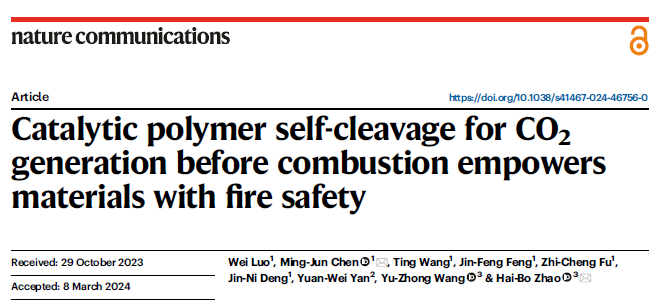 近日,理学院功能高分子材料绿色制备与循环利用研究团队2021级硕士研究生罗伟,以第一作者身份在Nature Communications(IF=16.6)上发表题为“Catalytic polymer self-cleavage for CO2 generation before combustion empowers materials with fire safety”的研究论文。理学院陈明军教授和四川大学赵海波教授为共同通讯作者,该工作得到了四川大学王玉忠院士和中车集团株洲时代新材料科技股份有限公司正高级工程师颜渊巍博士等人的指导与帮助。该工作得到了国家自然科学基金项目(21975208、U22A20150和22205184)和四川省科技计划项目(2023ZYD0030和2020JDJQ0062)的资助。