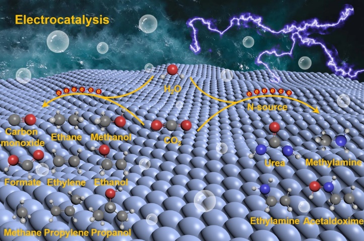 图1. CO2电还原为不同含碳产品(如CO、甲酸、烃类和醇类分子等)以及构建电催化C-N耦合产含氮有机化合物(如尿素、甲胺以及乙胺等)的反应示意图。