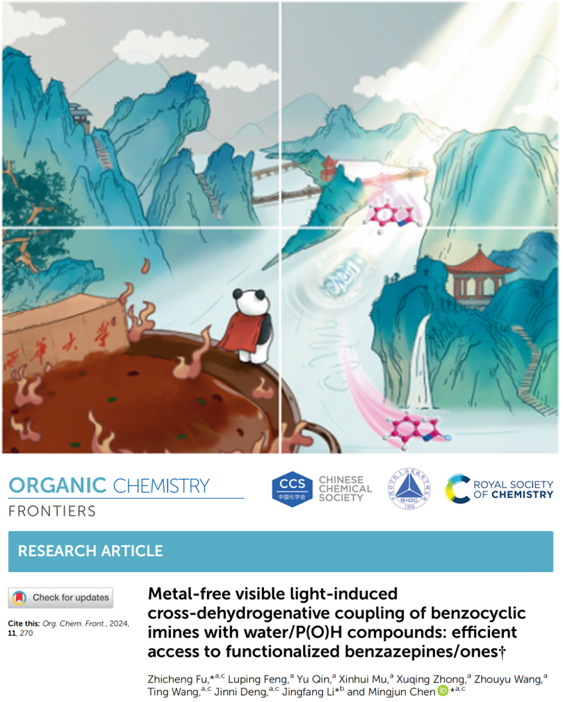 图1. 封面亮点介绍论文(Organic Chemistry Frontiers, 2024, 11, 270-276),封面以世界水利工程文化遗产都江堰和西华大学为背景,将化学与自然之美融为一体,同时融合了世界上最受欢迎的大熊猫和成都的标志性火锅等元素,利用阳光和河流的相互作用来展示光催化连续流化学技术的神奇力量。随着河流的流动,它们象征着这项技术对我们未来生活的无限潜力。