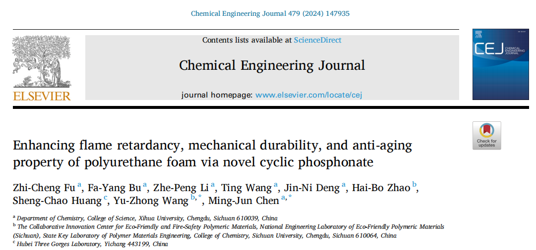 近日,理学院陈明军教授带领的功能高分子材料绿色制备与循环利用研究团队取得阻燃剂绿色合成与应用研究新进展。光催化连续流技术绿色合成阻燃剂的研究工作,发表在化学领域主流刊物Organic Chemistry Frontiers (中科院1区TOP,IF: 5.4)上,且被评为当期封面文章进行亮点介绍 (见图1),该工作第一作者为理学院符志成博士,通讯作者为陈明军教授,得到了重庆邮电大学李经方老师和北京化工大学杨占会老师的指导;铜离子掺杂膨胀阻燃抑烟环氧树脂的研究工作发表在材料科学领域主流刊物Composites Part B-Engineering (中科院1区TOP,IF: 13.1)上,并入选ESI高被引论文 (见图2), 该工作第一作者为理学院2019级硕士研究生何磊,通讯作者为汪婷副教授和陈明军教授;与四川大学王玉忠院士合作完成的新型环状磷酸酯高阻燃聚氨酯的研究工作,发表在化工领域顶级刊物Chemical Engineering Journal (中科院1区TOP,IF: 15.1)上,该工作的第一作者为理学院符志成博士,通讯作者为王玉忠院士和陈明军教授 (见图3)。