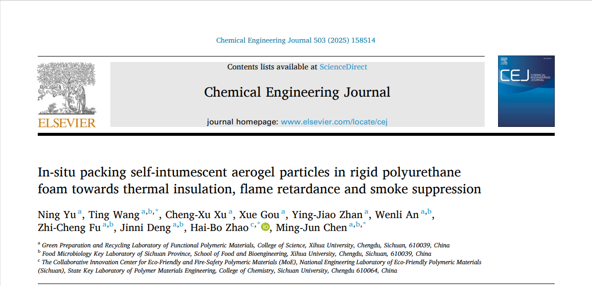 近日,理学院功能高分子材料绿色制备与循环利用研究团队在阻燃保温复合材料研究上取得新进展。相关成果发表在材料领域著名刊物Chemical Engineering Journal(中科院1区TOP,IF: 13.4),第一作者为理学院2025届材料科学与工程专业硕士研究生余宁,通讯作者为汪婷副教授、陈明军教授,以及四川大学赵海波教授,西华大学为第一单位。