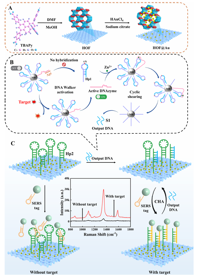 洛美沙星(LOM)是一种有效的抗生素,如果长期食用,可能会导致肝损伤和其他不良反应。因此,本研究提出了一种DNA酶介导的DNA walker作为信号放大器,结合负载大量金纳米粒子的氢键有机骨架(HOFs)作为表面增强拉曼散射(SERS)基底,实现对食品中LOM的高灵敏检测。至关重要的是,由于HOF的高比表面积和强吸附能力,其充当了大量金纳米粒子原位生长的理想基底,形成的SERS基底HOF@Au表现出稳健和均匀的信号增强。一旦目标物LOM存在,DNA酶被激活以启动DNA步行器并大量产生单链DNA,从而进一步触发催化发夹组装(CHA)。此外,Au@Ag@4-硝基苯硫醇(4-NTP)@Au@Hp3的多间隙核壳结构提供了更多的SERS“热点”并显著放大了局部电磁场,并与HOF@Au协同增强了4-NTP的拉曼信号。利用这一原理,该传感器通过“信号开启”策略实现了LOM的超灵敏检测,检测限低至4.62 × 10-14 mol/L。这一策略为设计新型SERS生物传感器用于食品中抗生素的灵敏和选择性检测探索了一条有意义的创新之路。