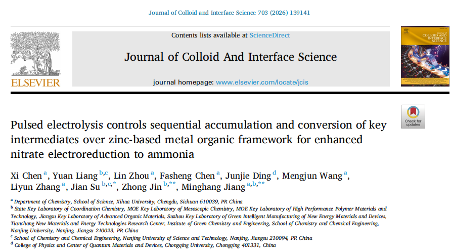 近日,理学院江明航副教授课题组及合作者在国际TOP学术期刊《Journal of Colloid and Interface Science》(中科院一区,IF=9.7)上发表题为“Pulsed electrolysis controls sequential accumulation and conversion of key intermediates over zinc-based metal organic framework for enhanced nitrate electroreduction to ammonia”的研究论文。江明航副教授为该论文通讯作者,南京大学金钟教授和南京理工大学苏剑教授为本文共同通讯作者。西华大学2023级硕士研究生陈羲为第一作者。西华大学为第一通讯单位。