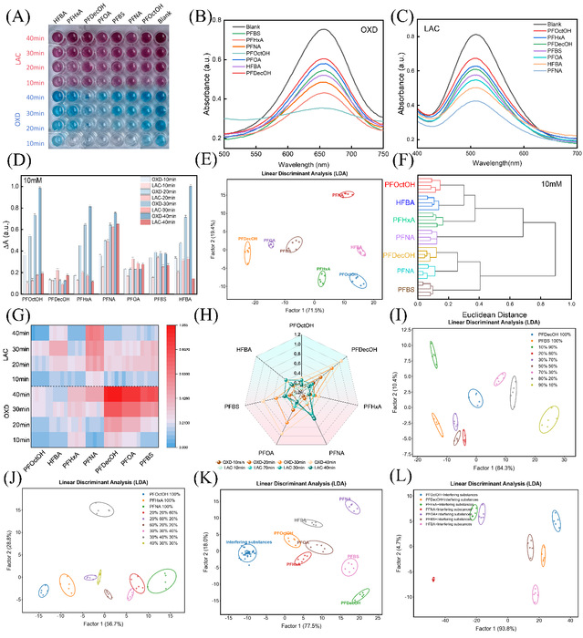 图4所示。(A)不同PFAS对Fe/NC-@L31的类OXD活性和类LAC活性的比色响应图。不同PFAS存在下Fe/NC-@L31+TMB体系(B)和Fe/NC-@L31+2,4-DP + 4-AP 的紫外可见光谱(C)。(D)指纹图谱,(E) LDA, (F)层次聚类分析(HCA),(G)热图,(H)传感器阵列对浓度为10 mM的7种PFAS的雷达图。(J)浓度为1 mM时,传感器阵列对不同摩尔比的二元(I)和三元PFAS混合物的LDA图。(K)区分PFAS(1 mM)和干扰物质(水中常见干扰物质)的LDA图:HCO3−,CO32−,Fe2+, Cu2+, Ca2+, Mg2+, K+, HPO42−,干扰物质的浓度为50 mM)。(L)在干扰物质(50 mM)存在下PFAS(1 mM)的LDA图。