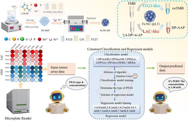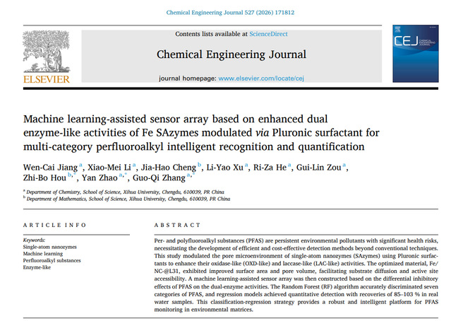 近日,西华大学理学院张国麒团队在国际权威期刊《Chemical Engineering Journal》(中科院一区Top,IF=13.2)上发表了一项题为“Machine learning-assisted sensor array based on enhanced dual enzyme-like activities of Fe SAzymes modulated via Pluronic surfactant for multi-category perfluoroalkyl intelligent recognition and quantification”的研究性论文,西华大学2023级化学专业研究生蒋文彩为第一作者,理学院数学系侯智博博士、化学系赵艳教授和张国麒博士为该论文的通讯作者,西华大学为第一通讯单位。