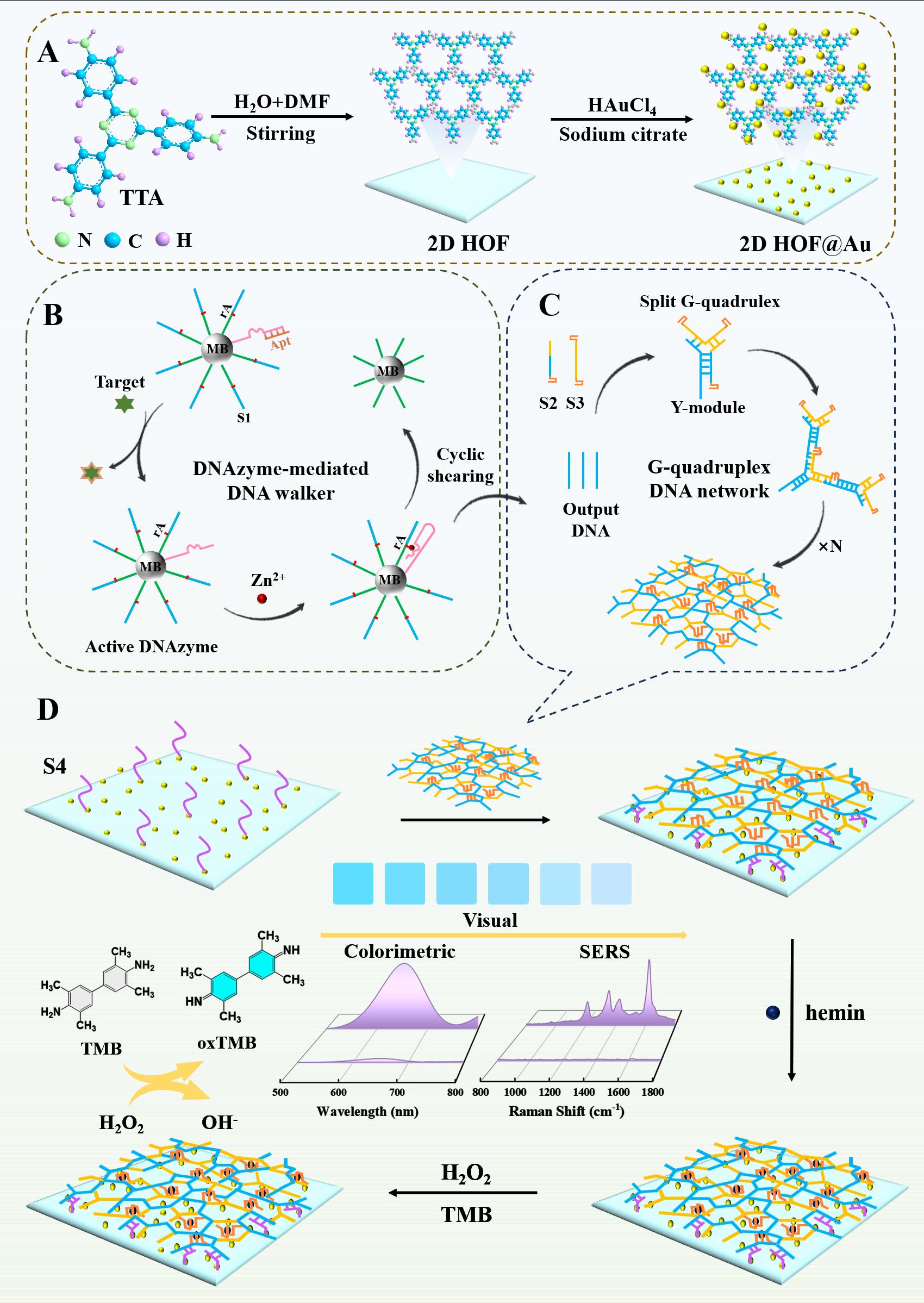 在本研究中,采用了一种二维氢键有机框架(2DHOF)@Au作为表面增强拉曼散射(SERS)基底并协同G-四链体 DNA网络(GDN)作为高效的信号催化剂,实现了对洛美沙星(LOM)的低背景三模式检测。具有大比表面积和丰富-NH2功能基团 的2D HOF 作为负载大量Au NPs的理想纳米载体,从而产生强大的电磁场增强。随后,目标物诱导的 DNA Walker高效剪切以产生大量输出DNA,进一步提高了检测系统的选择性。通过将 DNA链 S2和 S3 的末端区域设计为分裂的G四链体片段,并与输出DNA结合形成“Y形”结构,并进一步组装形成富含G四链体的DNA网络结构。该网络结构可以捕获大量的hemin,从而产生高效的过氧化物酶活性。值得注意的是,与采用纳米线作为载体来构建G-四链体结构的传统方法相比,这种 DNA 网络具有更出色的结构稳定性和稳定的催化性能。此外,将分裂后的G四链单元重新组合成完整的 G四链结构,显著降低了背景信号,并最大程度地减少了非特异性阳性反应。最后,富含G四链结构的 GDN 与DNA修饰的2D HOF结合,将H2O2转化为羟基自由基以进一步催化四甲基联苯胺(TMB)转化为oxTMB,从而产生明显的颜色变化和SERS信号。通过该策略能够实现对LOM的SERS、比色和视觉检测,检测限分别低至 6.54 × 10-14mol/L、3.27 × 10-11mol/L和5.31 × 10-11mol/L。该方法已成功应用应用于实际样本的检测,证明了其在实际应用中具有巨大的潜力。